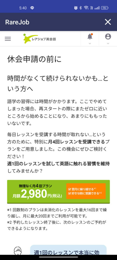 しかし、レアジョブでは毎日プランであれば月1回無料で予約ができます。